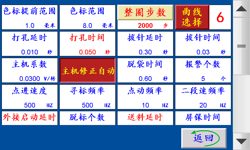 五、副菜单 色标范围:制作彩色制品时,伺服(步进)电机以恒定的速度寻找色标点的范围(即色标光电在『长度—设定的色标范围长度』范围内寻找色标,寻至『长度+设定的色标范围长度』。 色标提前范围:制作彩色制品时,伺服(步进)电机在料送结束之前,提前以恒定的速度寻找色标。 打孔延时:送料结束后延时此参数设定的时间后打孔信号输出。 打孔时间:伺服(步进)电机转结束,打孔电磁阀工作的时间。 拔针延时:一批结束后延时此参数设定的时间后拔针信号输出。 拔针时间:一批结束后延时“拔针延时”的时间后拔针信号输出,跟脱袋信号一起断开。 横吹百分比:由输入点X01送料信号控制横吹信号输出,输出时间由此参数来设定调节。 竖吹时间:由输入点竖吹输入控制竖吹信号输出,时间由此参数来设定调节。 脱袋时间:一批结束后延时“拔针延时”加“拔针时间”的时间后脱袋信号输出,时间结束后跟拔针信号一起断开。 报警个数:一批结束前提前N个报警。 点进速度:伺服(步进)电机的点进/点退时的速度,设定越大,伺服(步进)电机的转速越快。 寻标频率:伺服(步进)电机追色标时的速度,设定越大,伺服(步进)电机的转速越快。 点动频率:停止状态下,X04(点动)收到信号时,Y07主机信号输出,切刀上下运行,速度由此参数调节。 二段速频率:主机运行时按停止键,主机切换成二段速?;?,二段速速度由此参数调节。 外接启动延时:点击外接启动按钮时,持续该时间后主机开始启动。 脱标个数:设定N个,制作彩色制品时,跟踪N次色标点,跟踪不住自动?;?/span> 送料延时:下一次送料时,延时送料延时时间后开始送料。 屏保时间:主机运行状态下,在主界面停留此时间进入屏保状态。(设置0则屏保无效) 烫压时间:遇到烫压信号,主机信号关闭的时间。 总数?;鍪鹤苁;柚酶鍪苁酱锷瓒ǜ鍪蓖;?/span> ?;厮醭ざ龋好看瓮;?,送料往回缩的长度 ?;涨懈鍪好看瓮;保骰枰涨械拇问?。 辅助百分比:辅助信号与送料同步,由送料长度的百分比提前结束辅助送料信号。 整圈步数:伺服(步进)电机转一圈所需要的脉冲个数。 曲线选择:1~9,步进电机默认1,伺服电机默认6 主机系数:控制主机速度快慢。 主机修正手动/主机修正自动: 主机修正手动:手动调节主机系数来改变主机速度 主机修正自动:自动修正好主机速度对应的主机系数大小。