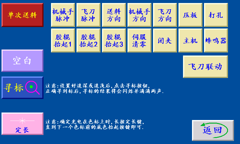 寻标:当‘寻标’键选择“深色/浅色”时按此键,伺服(步进)电机一直转到深色的色标点自动停转时,设置为“追深”;伺服(步进)电机一直转到浅色的色标点自动停转时,设置为“追浅。