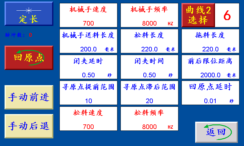 回原点延时:机械手松料结束后,延时该时间后再回前限位。