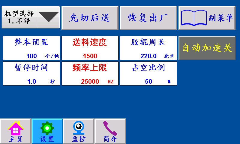 不停/暂停/停机:“不停”:一批结束主机不停,继续正常工作。 “暂停”:一批结束主机暂停,停到暂停时间结束,主机自动开机。 “停机”:一批结束主机自动停机后不再运行,手动按启动键方可运行。 先切后送/先送后切:“先切后送”:按启动键,主机先运行,GK1霍尔开关检测到伺服(步进)电机的送料信号,伺服(步进)电机开始送料。 “先送后切”:按启动键,伺服(步进)先送料,送料结束后主机再运行。 恢复出厂:按此键恢复出厂设置(慎用)。 副菜单:点击此键进入副菜单界面。 整本预置:一批设定的个数,提前5个报警。单位:个 送料速度:伺服(步进)电机的加减速时间,设定越大,伺服(步进)电机起步越快。 频率上限:伺服(步进)电机的最高转速,设定越大,伺服(步进)电机的转速越快。 暂停时间:当机型选择暂停,一批结束后主机自动停机所设定的时间。 胶辊周长:伺服(步进)电机带动橡胶辊转一圈的长度。 占空比例:“自动送料”时,主机运行一个周期送料所占的时间比例。