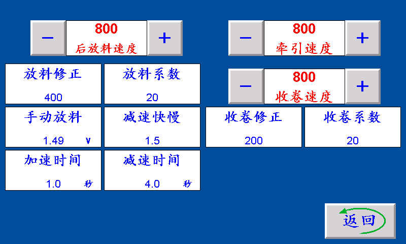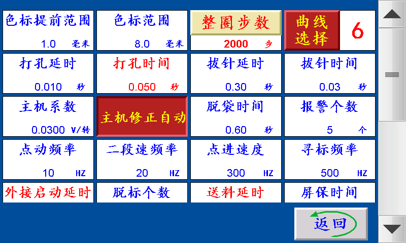 色标范围:制作彩色制品时,伺服(步进)电机以恒定的速度寻找色标点的范围(即色标光电在『长度—设定的色标范围长度』范围内寻找色标,寻至『长度+设定的色标范围长度』。 色标提前范围:制作彩色制品时,伺服(步进)电机在料送结束之前,提前以恒定的速度寻找色标。 打孔延时:送料结束后延时此参数设定的时间后打孔信号输出。 打孔时间:伺服(步进)电机转结束,打孔电磁阀工作的时间。 拔针延时:一批结束后延时此参数设定的时间后拔针信号输出。 拔针时间:一批结束后延时“拔针延时”的时间后拔针信号输出,跟脱袋信号一起断开。 脱袋时间:一批结束后延时“拔针延时”加“拔针时间”的时间后脱袋信号输出,时间结束后跟拔针信号一起断开 横吹百分比:由输入点X01送料信号控制横吹信号输出,输出时间由此参数来设定调节。 竖吹时间:由输入点竖吹输入控制竖吹信号输出,时间由此参数来设定调节。 报警个数:一批结束前提前N个报警。 点动频率:停止状态下,X04(点动)收到信号时,Y07主机信号输出,切刀上下运行,速度由此参数调节。 二段速频率:主机运行时按停止键,主机切换成二段速停机,二段速速度由此参数调节。 点进速度:伺服(步进)电机的点进/点退时的速度,设定越大,伺服(步进)电机的转速越快。 寻标频率:伺服(步进)电机追色标时的速度,设定越大,伺服(步进)电机的转速越快。 外接启动延时:点击外接启动按钮时,持续该时间后主机开始启动。 脱标个数:设定N个,制作彩色制品时,跟踪N次色标点,跟踪不住自动停机。 送料延时:下一次送料时,延时送料延时时间后开始送料。 屏保时间:主机运行状态下,在主界面停留此时间进入屏保状态。(设置0则屏保无效) 整圈步数:伺服(步进)电机转一圈所需要的脉冲个数。 曲线选择:1~9,步进电机默认1,伺服电机默认6 主机系数:控制主机速度快慢。 主机修正手动/主机修正自动: 主机修正手动:手动调节主机系数来改变主机速度 主机修正自动:自动修正好主机速度对应的主机系数大小。 送料多走长度:主机运行过程中,料送结束后没有检测到补偿信号,下一次送料补偿伺服(步进)电机多走长度。
