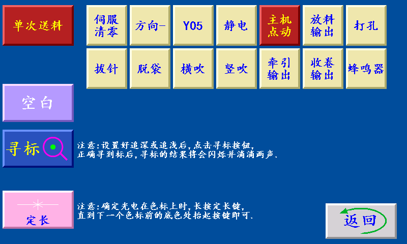 单次送料:停机状态下,点击此键,送一次料后停止。 寻标:当‘寻标’键选择“深色/浅色”时按此键,伺服(步进)电机一直转到深色的色标点自动 停转时,设置为“追深”;伺服(步进)电机一直转到浅色的色标点自动停转时,设置为“追浅。 当‘寻标’键选择“空白”时,按此键无效 (注释:黄色按键在停机状态下,测试脚位是否正常)