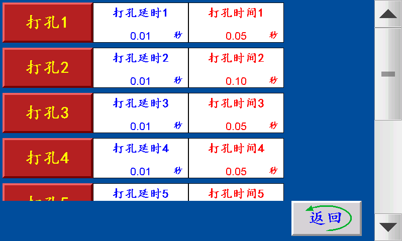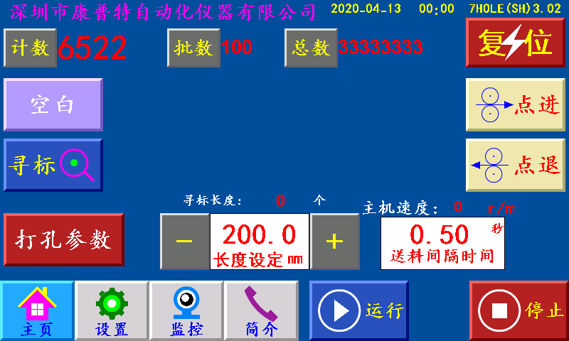 点进速度:伺服(步进)电机的点进/点退时的速度,设定越大,伺服(步进)电机的转速越快。 寻标频率:伺服(步进)电机追色标时的速度,设定越大,伺服(步进)电机的转速越快。 脱袋时间:一批结束后后脱袋信号输出,时间结束后脱袋信号断开 整圈步数:伺服(步进)电机转一圈所需要的脉冲个数。 六、打孔参数 ![]() 打孔延时:送料结束后延时此参数设定的时间后打孔信号输出。 打孔时间:伺服(步进)电机转结束,打孔电磁阀工作的时间。 (注释:打孔按键在停机状态下,测试脚位是否正常) 七、外接附件 1、 色标光电 红:+24V;黑:GND;白或绿:输入信号 2、 蜂鸣器 红:+24V;黑:蜂鸣器信号