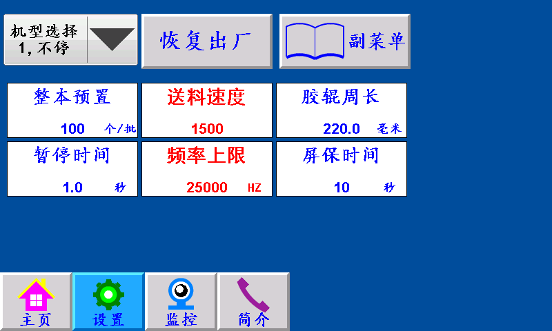 三、主页 ![]() 长度设定:显示制袋所设定长度,单位:毫米(也可以当按键直接调节长度) 送料间隔时间:每次伺服(步进)电机转结束后间隔N时间下次伺服(步进)电机转。 主机速度:控制主机加减速快慢。 计数/清零:单批次累计到一批个数结束时,个数自动归零;按“计数/清零”键清零清个数。 批数/清零:一批结束后,批数加“1”, 总数/清零:个数每加一个,总数加“1”;按“总数/清零”键清零总数。 空白/深色/浅色:三种状态切换。 空白:指光电忽略色标光电传感器信号; 深色:指跟踪印刷制品时,以深颜色的色标点为跟踪点; 浅色:指跟踪印刷制品时,以浅颜色的色标点为跟踪点。 寻标:当‘寻标’键选择“深色/浅色”时按此键,伺服(步进)电机一直转到深色的色标点自动停转时,设置为“追深”;伺服(步进)电机一直转到浅色的色标点自动停转时,设置为“追浅。 当‘寻标’键选择“空白”时,按此键无效 点进:在停止状态下,手动伺服(步进)电机正转。 点退:在停止状态下,手动伺服(步进)电机反转,在运行状态下此键变为“补数”,按此键计数减1。 复位:系统不能正常工作时,按此键程序重新启动,也可以做紧急停机用。 运行:按此键,主机正常运行。(长按3秒左右) 停止:按此键,霍尔开关GK1检测到高位停机信号;主机自动停机。 状态显示:运行/停止/超速/暂停/脱标/断料,六种状态切换显示。 运行:按启动键后显示“运行”。 停止:通电后一直显示“停止”。 超速:主机速度过快步进(伺服)电机送料还没有结束时,主机停机显示“超速”。 暂停:当机型选择“暂停”时一批结束停机N秒后主机自动开机。 脱标:在制作印刷制品时没有跟踪到色标点显示“脱标”。 断料:当主机运行,X15检测到断料信号时,蜂鸣器报警,主机停机,显示故障“断料”。主机停止状态下X15检测到断料信号时,蜂鸣器报警,显示故障“断料”。(按“停止”清除故障) 四、设置 ![]() 不停/暂停/停机:“不停”:一批结束主机不停,继续正常工作。 “暂停”:一批结束主机暂停,停到暂停时间结束,主机自动开机。 “停机”:一批结束主机自动停机后不再运行,手动按启动键方可运行。 恢复出厂:按此键恢复出厂设置(慎用)。 副菜单:点击此键进入副菜单界面。 整本预置:一批设定的个数,提前5个报警。单位:个 送料速度:伺服(步进)电机的加减速时间,设定越大,伺服(步进)电机起步越快。 胶辊周长:伺服(步进)电机带动橡胶辊转一圈的长度。 暂停时间:当机型选择暂停,一批结束后主机自动停机所设定的时间。 频率上限:伺服(步进)电机的最高转速,设定越大,伺服(步进)电机的转速越快。 屏保时间:主机运行状态下,在主界面停留此时间进入屏保状态。(设置0则屏保无效) 五、副菜单 ![]() 色标范围:制作彩色制品时,伺服(步进)电机以恒定的速度寻找色标点的范围(即色标光电在『长度—设定的色标范围长度』范围内寻找色标,寻至『长度+设定的色标范围长度』。 报警个数:一批结束前提前N个报警。
