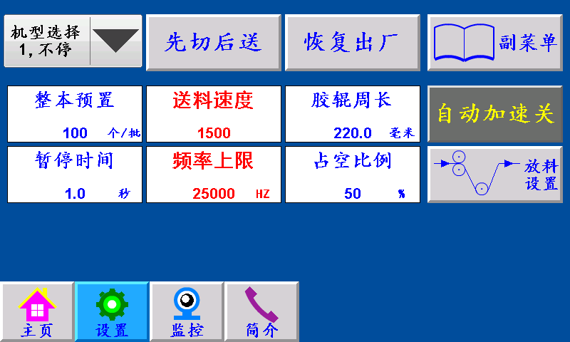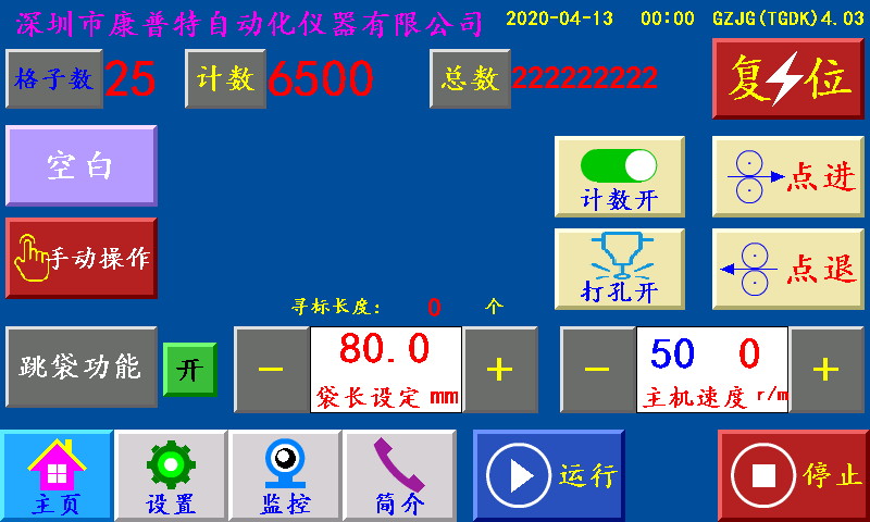 状态显示:运行/停止/切刀降速/暂停/脱标/完料,六种状态切换显示。