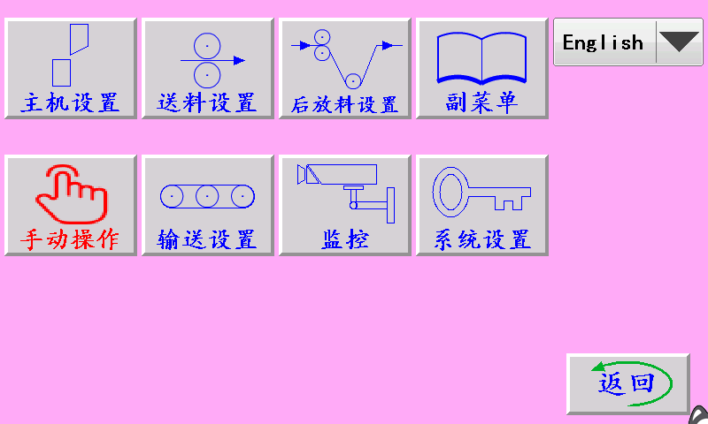 主机设置:按此键进入进入主机设置界面。 后放料设置:按此键进入进入后放料设置界面。 副菜单:按此键进入进入副菜单界面。 手动操作:按此键进入进入光电设置界面。 输送设置:按此键进入进入主机设置界面。 监控:按此键进入进入监控界面。 English/中文:中文和英文界面切换按键。 系统设置:按此键输入正确的密码,方可进入。