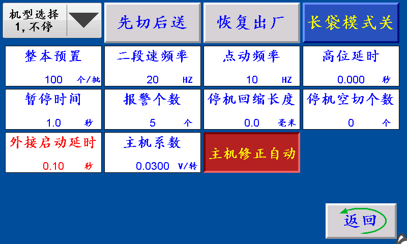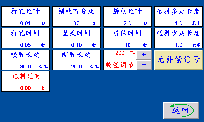 减速放料:未检测到放料开关信号时放料速度不变,检测到放料开关信号时减速。 打孔延时:送料结束后延时此参数设定的时间后打孔信号输出。 横吹百分比:由输入点X01送料信号控制横吹信号输出,输出时间由此参数来设定调节。 静电延时:输出与主机信号同步,主机停机后,静电信号延时此设定值后再关闭。 打孔时间:伺服(步进)电机转结束,打孔电磁阀工作的时间。 竖吹时间:由输入点竖吹输入控制竖吹信号输出,时间由此参数来设定调节。 屏保时间:主机运行状态下,在主界面停留此时间进入屏保状态。(设置0则屏保无效) 喷胶长度:料送到此长度时,喷胶信号输出的长度。 断胶长度:送料结束前剩余此长度,则喷胶信号关闭。 胶量调节:控制喷胶时的剂量千分比。 送料延时:下一次送料时,延时送料延时时间后开始送料。 无补偿信号/有补偿信号: 无补偿信号:补偿送料伺服(步进)电机多走少走由主页上补偿长度控制。 有补偿信号:未检测到补偿信号时,补偿送料伺服(步进)电机多走“送料多走长度”,检测到补偿信号时,补偿送料伺服(步进)电机少走“送料少走长度”。 送料多走长度:未检测到补偿信号时,补偿送料伺服(步进)电机多走“送料多走长度”。 送料少走长度:检测到补偿信号时,补偿送料伺服(步进)电机少走“送料少走长度”。