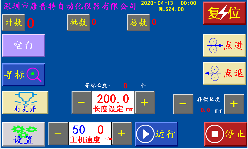 三、主页 长度设定:显示制袋所设定长度,单位:毫米(也可以当按键直接调节长度) 补偿长度:每隔一次送料,制袋所设定长度加补偿长度作为补偿,单位:毫米 主机速度:控制主机加减速快慢。 计数/清零:单批次累计到一批个数结束时,个数自动归零;按“计数/清零”键清零清个数。 批数/清零:一批结束后,批数加“1”, 总数/清零:个数每加一个,总数加“1”;按“总数/清零”键清零总数。 空白/深色/浅色:三种状态切换。 空白:指光电忽略色标光电传感器信号; 深色:指跟踪印刷制品时,以深颜色的色标点为跟踪点; 浅色:指跟踪印刷制品时,以浅颜色的色标点为跟踪点。 寻标:当‘寻标’键选择“深色/浅色”时按此键,伺服(步进)电机一直转到深色的色标点自动停转时,设置为“追深”;伺服(步进)电机一直转到浅色的色标点自动停转时,设置为“追浅。 当‘寻标’键选择“空白”时,按此键无效 点进:在停止状态下,手动伺服(步进)电机正转。 点退:在停止状态下,手动伺服(步进)电机反转,在运行状态下此键变为“补数”,按此键计数减1。 复位:系统不能正常工作时,按此键程序重新启动,也可以做紧急?;?。 运行:按此键,主机正常运行。(长按3秒左右) 停止:按此键,霍尔开关GK1检测到高位?;藕?;主机自动停机。 状态显示:运行/停止/超速/暂停/脱标/完料,六种状态切换显示。 运行:按启动键后显示“运行”。 停止:通电后一直显示“停止”。