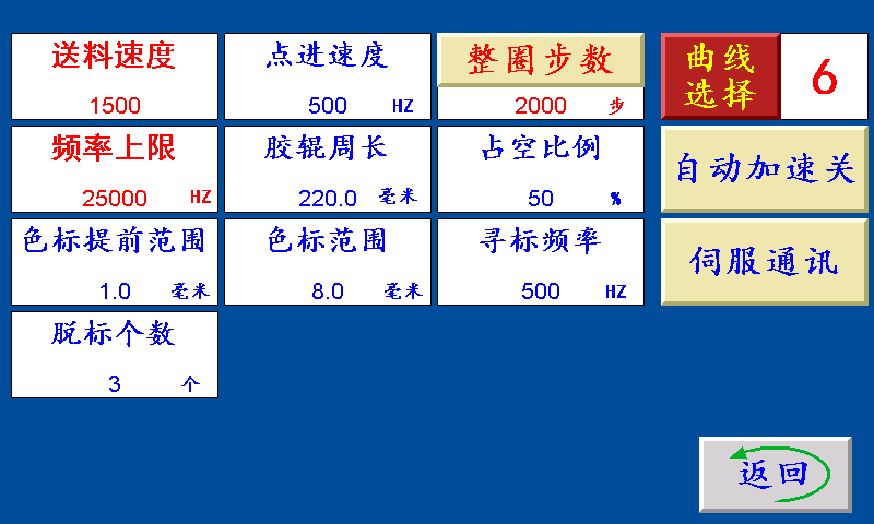 五、送料设置 点进速度:伺服(步进)电机的点进/点退时的速度,设定越大,伺服(步进)电机的转速越快。 整圈步数:伺服(步进)电机转一圈所需要的脉冲个数。 曲线慢速/曲线中速/曲线快速/曲线高速,4种不同的曲线切换。 送料速度:伺服(步进)电机的加减速时间,设定越大,伺服(步进)电机起步越快。 频率上限:伺服(步进)电机的最高转速,设定越大,伺服(步进)电机的转速越快。 胶辊周长:伺服(步进)电机带动橡胶辊转一圈的长度。 占空比例:“自动加速开”时,主机运行一个周期送料所占的时间比例。 色标范围:制作彩色制品时,伺服(步进)电机以恒定的速度寻找色标点的范围(即色标光电在『长度—设定的色标范围长度』范围内寻找色标,寻至『长度+设定的色标范围长度』。 色标提前范围:制作彩色制品时,伺服(步进)电机在料送结束之前,提前以恒定的速度寻找色标。 寻标频率:伺服(步进)电机追色标时的速度,设定越大,伺服(步进)电机的转速越快。 脱标个数:设定N个,制作彩色制品时,跟踪N次色标点,跟踪不住自动?;?/span> 自动加速关/自动加速开:自动加速关:自己调节送料速度 自动加速开:根据设定的袋长等自动调节送料速度 伺服通讯:点击此键进入伺服通讯界面