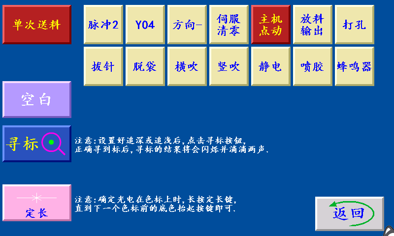 八、手动操作 单次送料:?;刺拢慊鞔思鸵淮瘟虾笸V埂?/span> 寻标:当‘寻标’键选择“深色/浅色”时按此键,伺服(步进)电机一直转到深色的色标点自动 停转时,设置为“追深”;伺服(步进)电机一直转到浅色的色标点自动停转时,设置为“追浅。 当‘寻标’键选择“空白”时,按此键无效