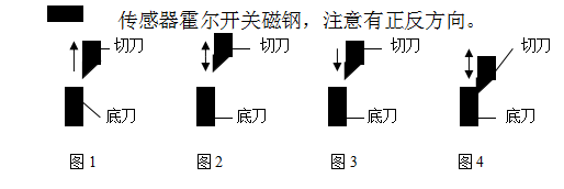 A ,开始送料位置,此时切刀向上运动,刚离开底刀,步进电机可顺利地将被制料送出(图1)。 B, 高位?;恢茫耸鼻械断蛏显硕?,至最高点,?;墒固糖械恫恢掠谄苹当恢屏希ㄍ?span style="font-family:"">2)。 C ,拖料极限位置,此时切刀向下运动,刚到底刀处,此时步进电机不能再送料,否则,被制料会堵于刀内或拉断(图3)。 D, 整本脱袋位置,此时切刀向下运动,刚到最低点,整本机在此位置将拉针拔出,再把整本制品推出(图4)。