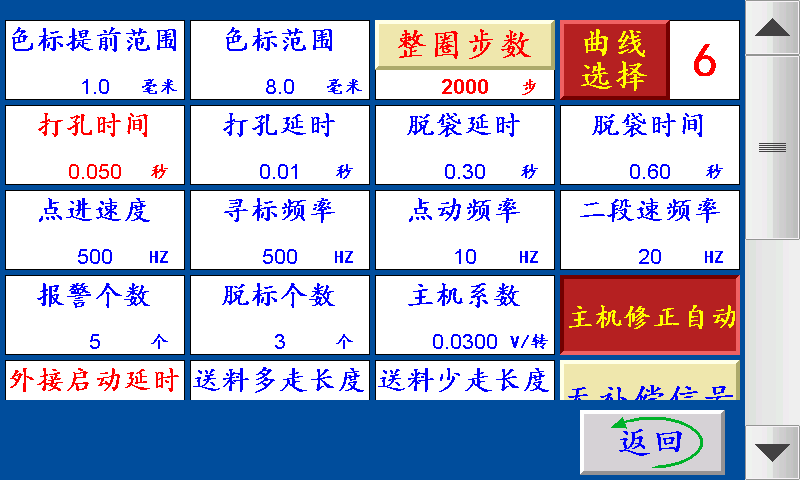 五、副菜单 色标范围:制作彩色制品时,伺服(步进)电机以恒定的速度寻找色标点的范围(即色标光电在『长度—设定的色标范围长度』范围内寻找色标,寻至『长度+设定的色标范围长度』。 色标提前范围:制作彩色制品时,伺服(步进)电机在料送结束之前,提前以恒定的速度寻找色标。 打孔延时:送料结束后延时此参数设定的时间后打孔信号输出。 打孔时间:伺服(步进)电机转结束,打孔电磁阀工作的时间。 脱袋时间:一批结束后延时“拔针延时”加“拔针时间”的时间后脱袋信号输出,时间结束后跟拔针信号一起断开。 报警个数:一批结束前提前N个报警。 点进速度:伺服(步进)电机的点进/点退时的速度,设定越大,伺服(步进)电机的转速越快。 寻标频率:伺服(步进)电机追色标时的速度,设定越大,伺服(步进)电机的转速越快。 点动频率:停止状态下,X04(点动)收到信号时,Y07主机信号输出,切刀上下运行,速度由此参数调节。 二段速频率:主机运行时按停止键,主机切换成二段速停机,二段速速度由此参数调节。 外接启动延时:点击外接启动按钮时,持续该时间后主机开始启动。 脱标个数:设定N个,制作彩色制品时,跟踪N次色标点,跟踪不住自动停机。 整圈步数:伺服(步进)电机转一圈所需要的脉冲个数。 曲线选择:1~9,步进电机默认1,伺服电机默认6 主机系数:控制主机速度快慢。 主机修正手动/主机修正自动: 主机修正手动:手动调节主机系数来改变主机速度 主机修正自动:自动修正好主机速度对应的主机系数大小。 无补偿信号/有补偿信号: 无补偿信号:补偿送料伺服(步进)电机多走少走由主页上补偿长度控制。 有补偿信号:未检测到补偿信号时,补偿送料伺服(步进)电机多走“送料多走长度”,检测到补偿信号时,补偿送料伺服(步进)电机少走“送料少走长度”。 送料多走长度:未检测到补偿信号时,补偿送料伺服(步进)电机多走“送料多走长度”。 送料少走长度:检测到补偿信号时,补偿送料伺服(步进)电机少走“送料少走长度”。