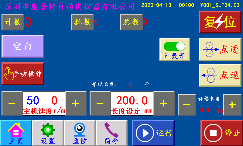 单次送料:停机状态下,点击此键,送一次料后停止。 寻标:当‘寻标’键选择“深色/浅色”时按此键,伺服(步进)电机一直转到深色的色标点自动停转时,设置为“追深”;伺服(步进)电机一直转到浅色的色标点自动停转时,设置为“追浅。 当‘寻标’键选择“空白”时,按此键无效